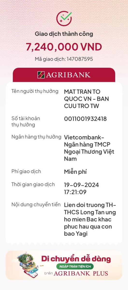 Trường TH&THCS Long Tân xin chân thành cảm ơn sự hỗ trợ quý báu của quý phụ huynh, CBGVNV và học sinh trong cuộc quyên góp ủng hộ miền Bắc khắc phục hậu quả cơn bão số 3 (bão YaGi). Sự chung tay, góp sức của quý phụ huynh, CBGVNV và học sinh đã góp phần to lớn vào việc giúp đỡ những người dân chịu ảnh hưởng nặng nề từ cơn bão.